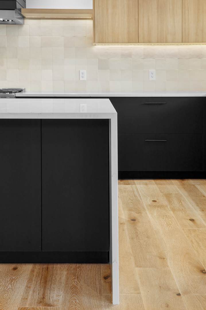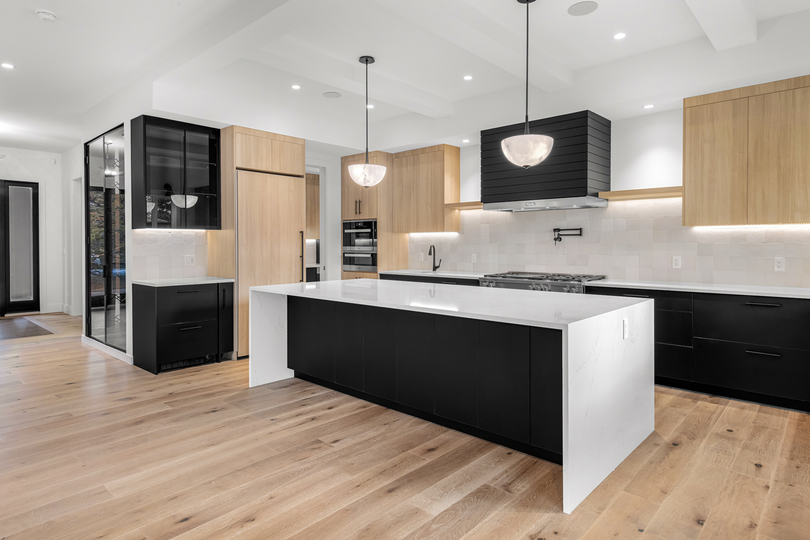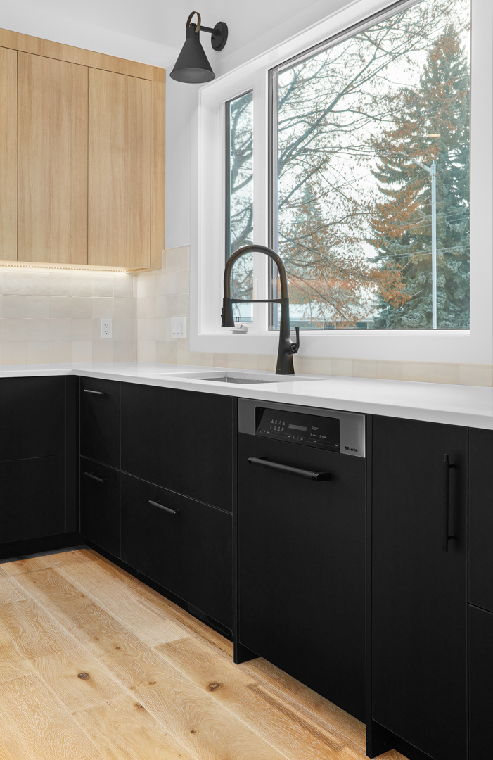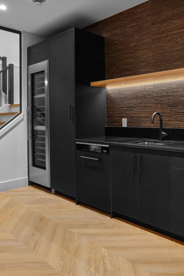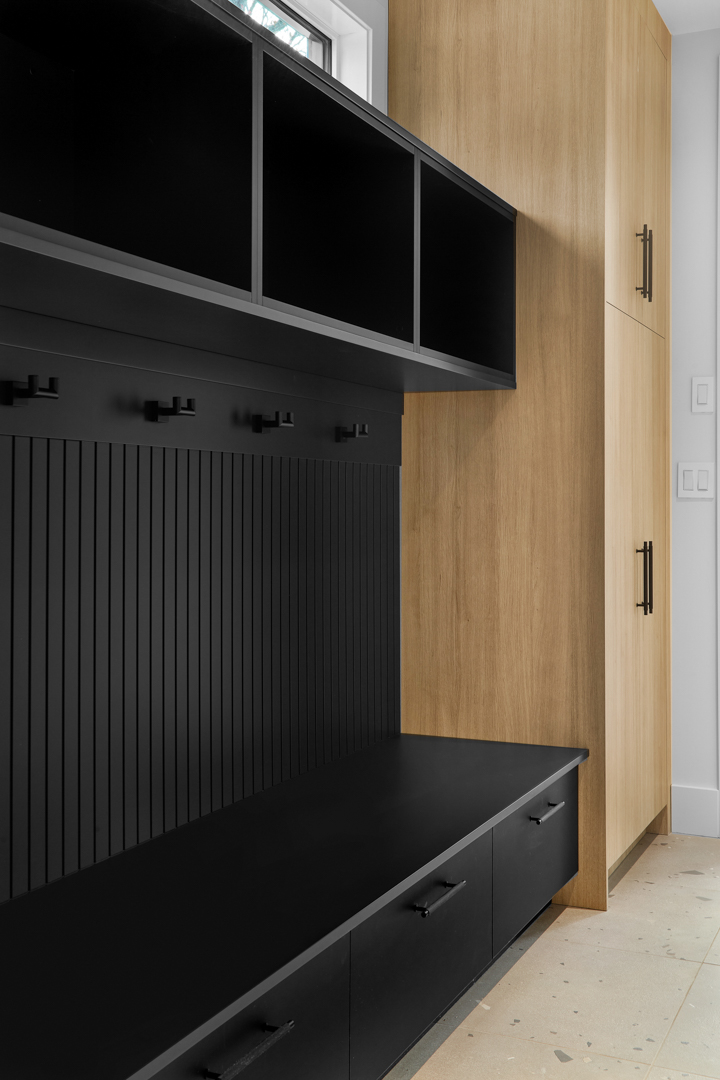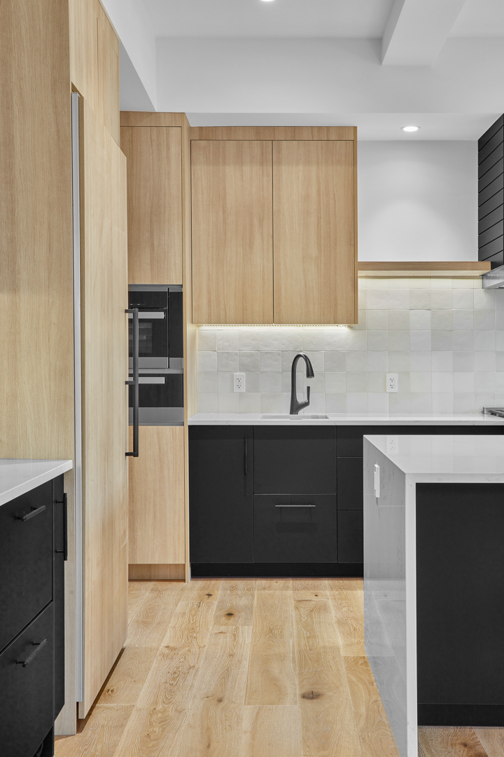 The Behouses Millwork project exemplifies the harmony of modern design principles with functional elegance, offering a striking balance between warm wood tones and sleek black finishes. Each space within the kitchen exudes a contemporary chic atmosphere, underscored by clean lines and minimalistic decor. The juxtaposition of natural wood elements with the deep black of the cabinetry and appliances creates a visually appealing contrast that is both inviting and sophisticated.