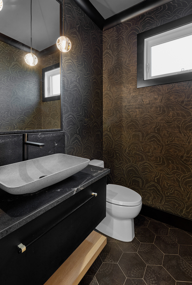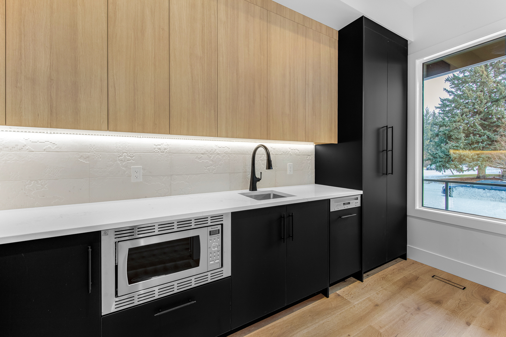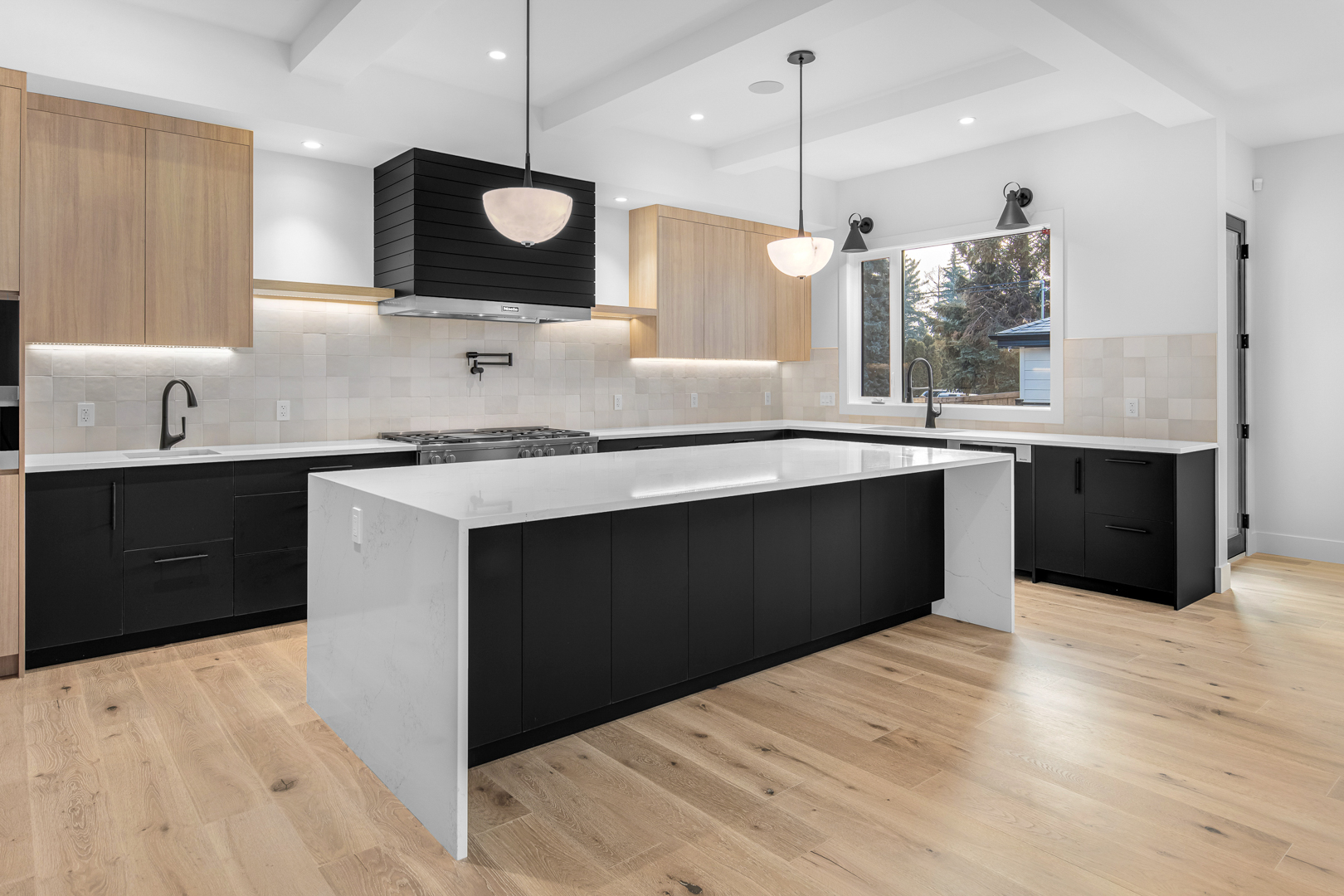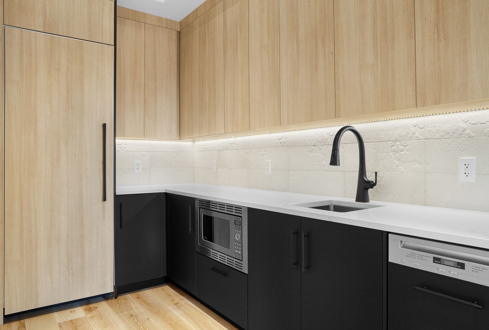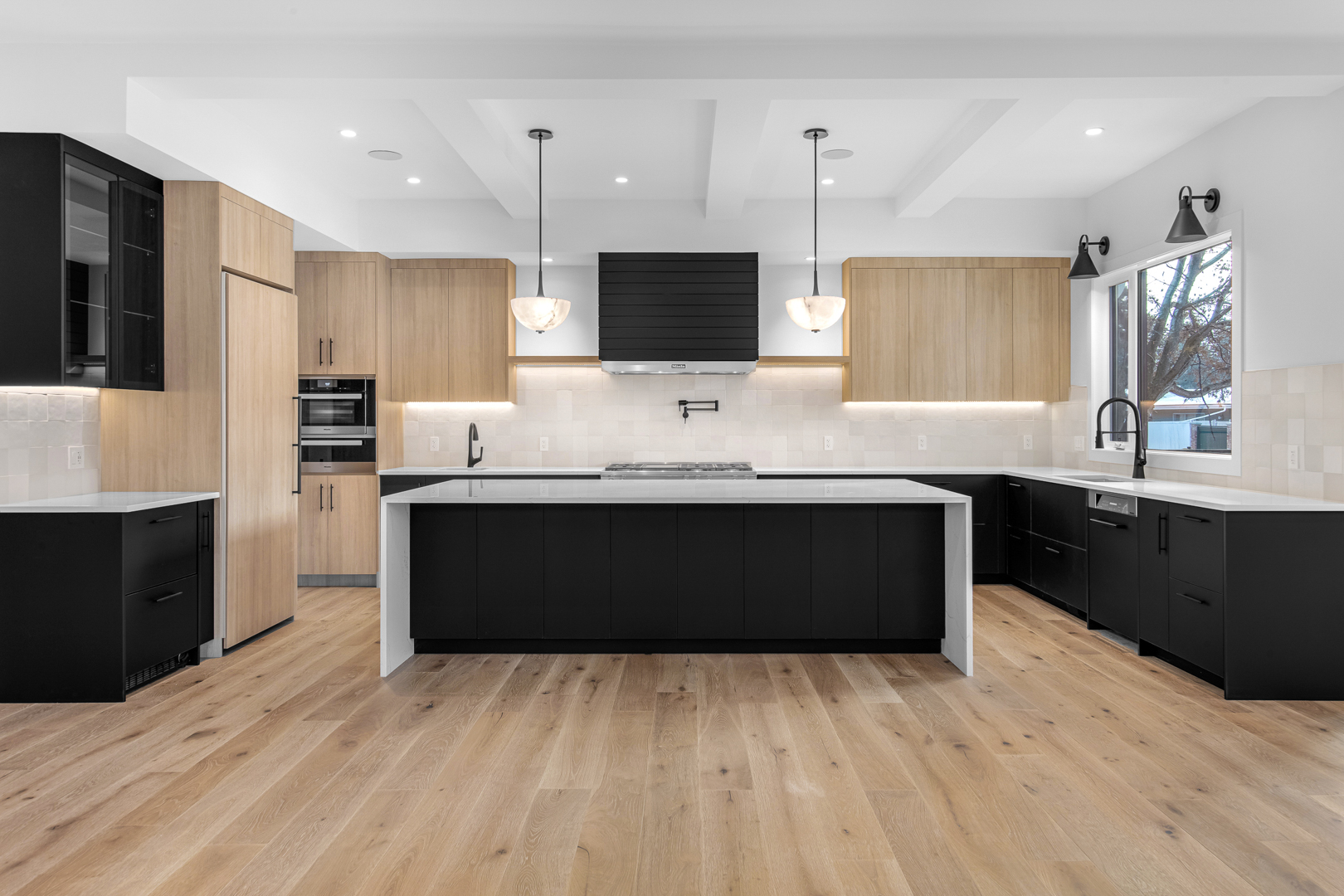 The Behouses Millwork project exemplifies the harmony of modern design principles with functional elegance, offering a striking balance between warm wood tones and sleek black finishes. Each space within the kitchen exudes a contemporary chic atmosphere, underscored by clean lines and minimalistic decor. The juxtaposition of natural wood elements with the deep black of the cabinetry and appliances creates a visually appealing contrast that is both inviting and sophisticated.