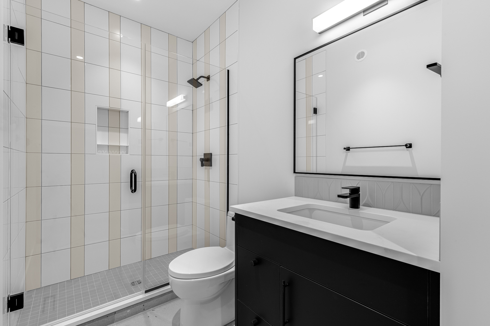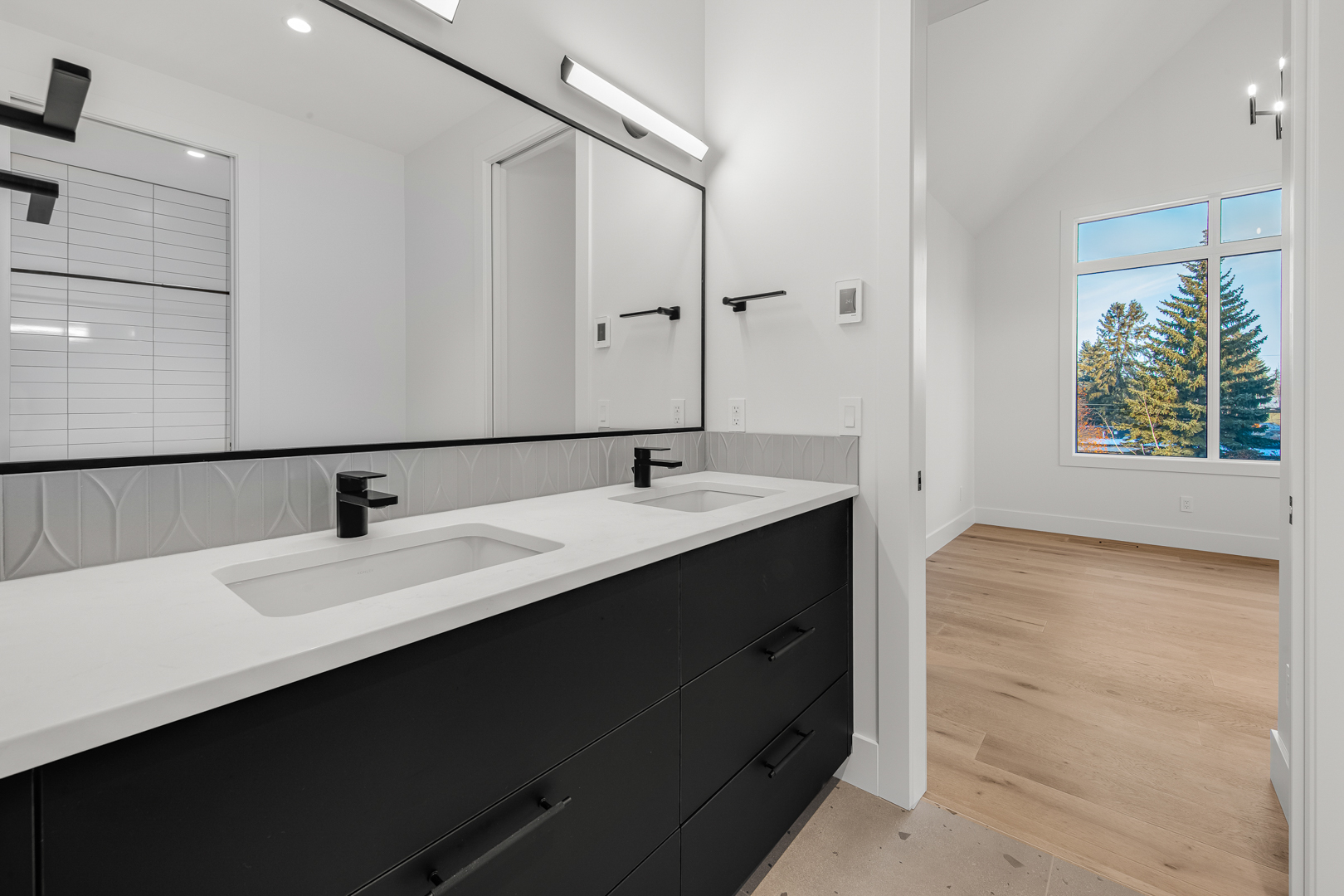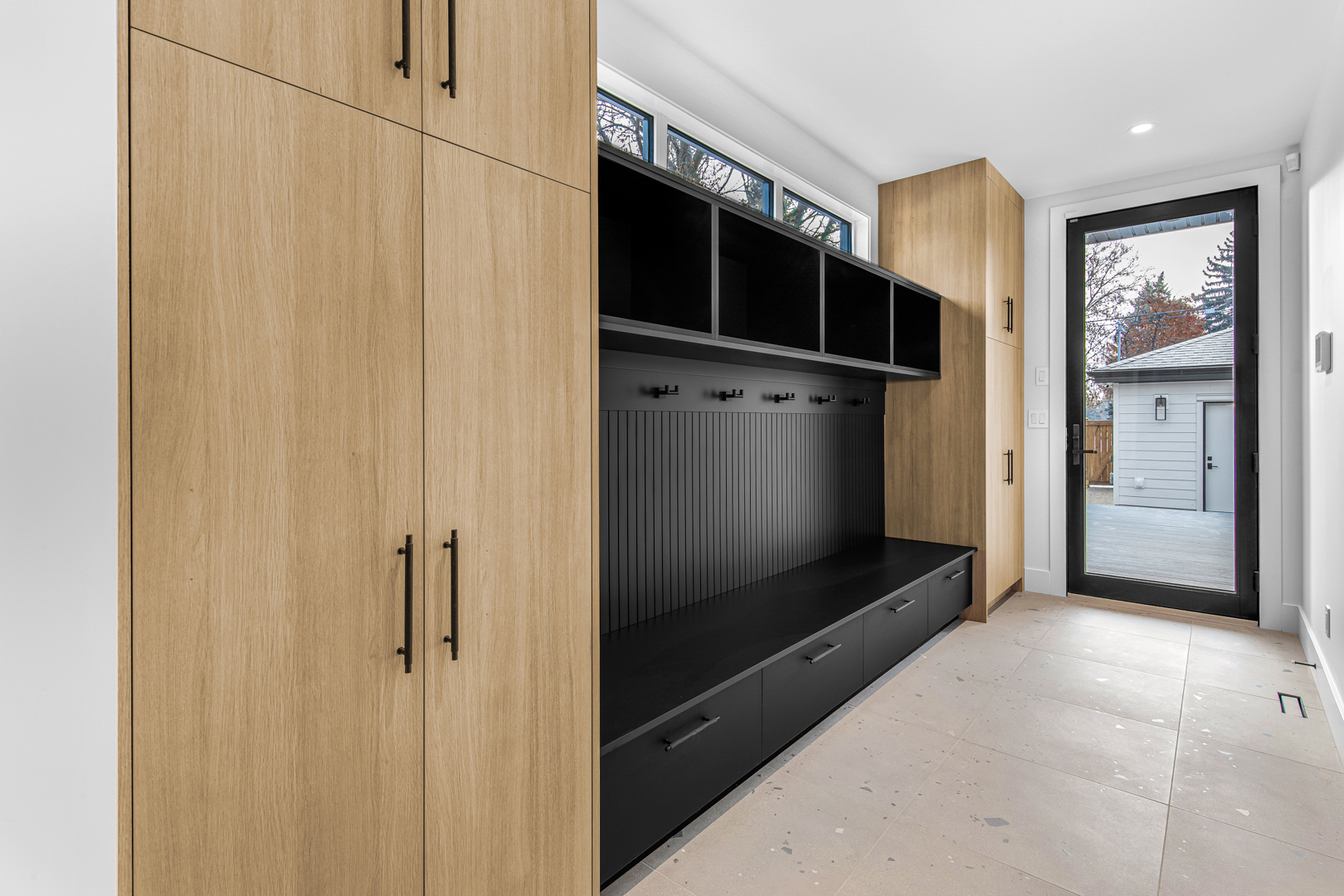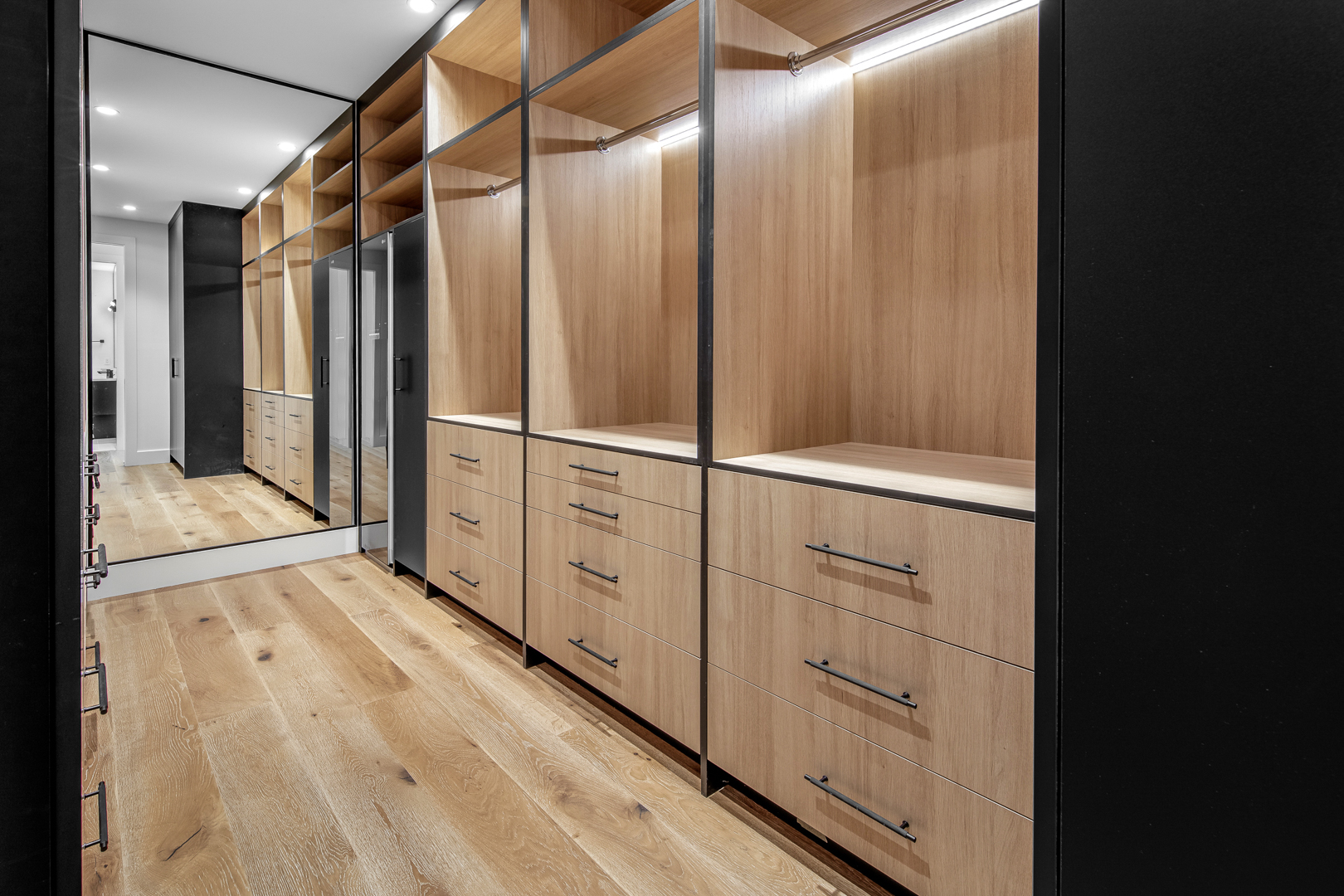 The Behouses Millwork project exemplifies the harmony of modern design principles with functional elegance, offering a striking balance between warm wood tones and sleek black finishes. Each space within the kitchen exudes a contemporary chic atmosphere, underscored by clean lines and minimalistic decor. The juxtaposition of natural wood elements with the deep black of the cabinetry and appliances creates a visually appealing contrast that is both inviting and sophisticated.