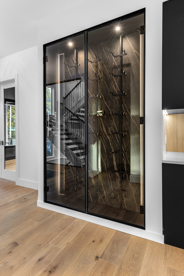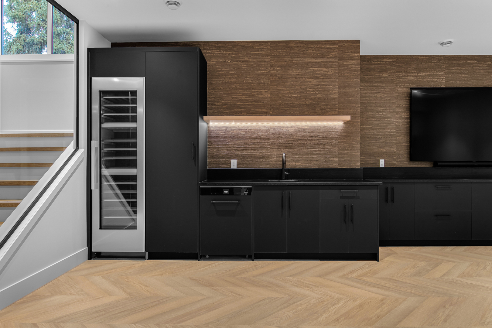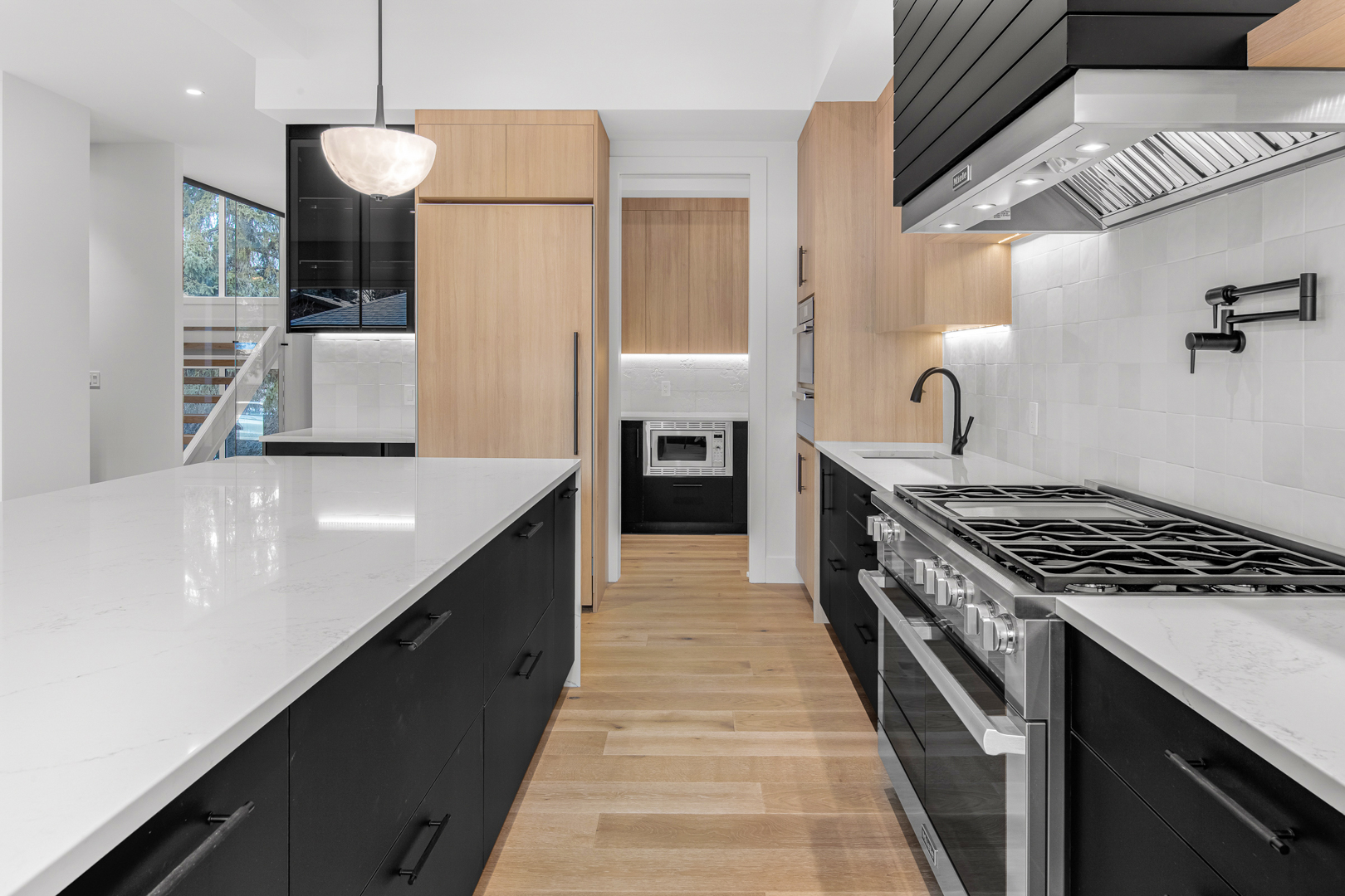 The design incorporates state-of-the-art appliances seamlessly integrated into the cabinetry, maintaining a streamlined look that emphasizes practicality without sacrificing style. Strategic lighting accentuates the clean, geometric shapes within the space, highlighting the exquisite craftsmanship of the millwork. The expansive windows ensure ample natural light, enriching the warmth of the wood and enhancing the overall openness of the layout.