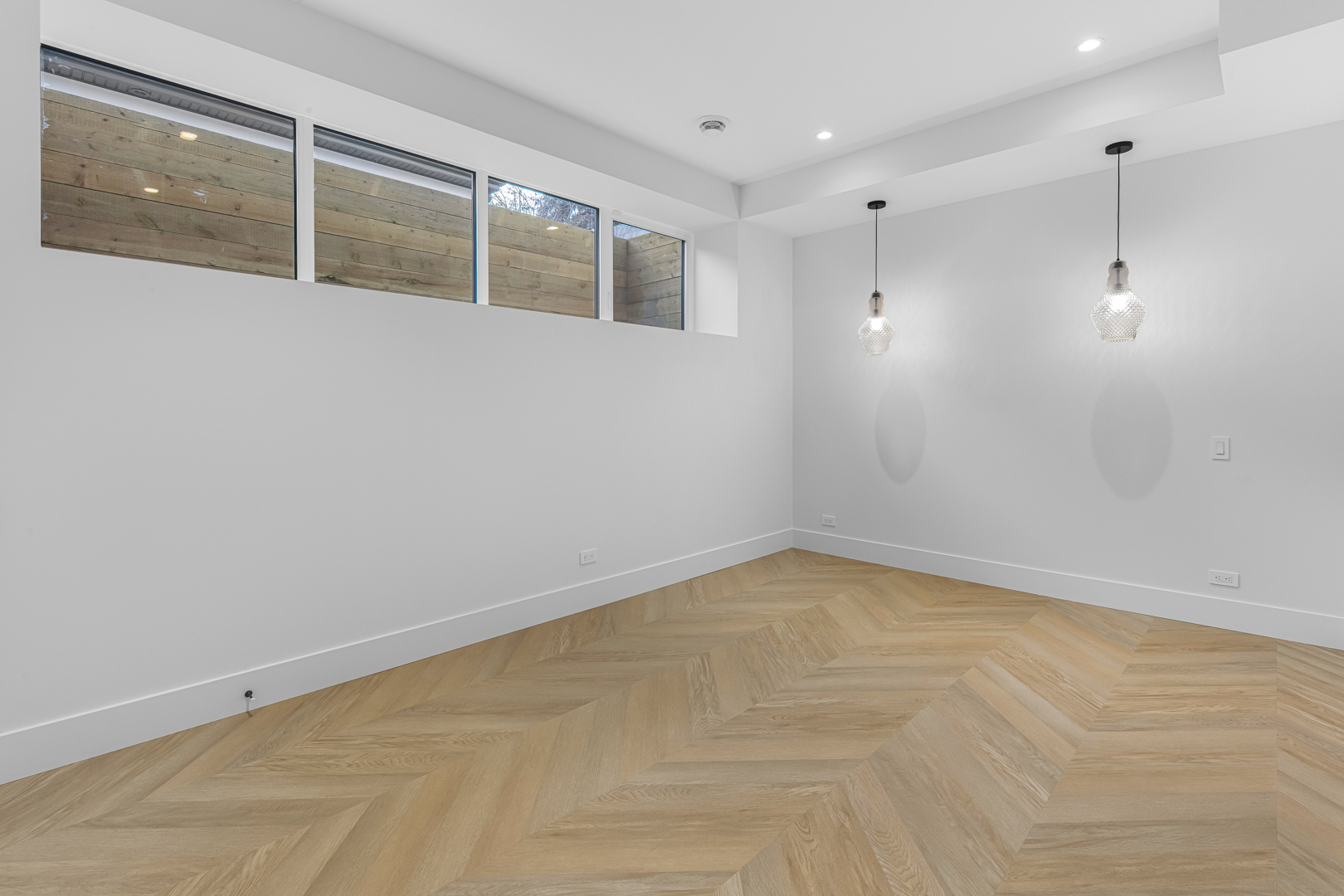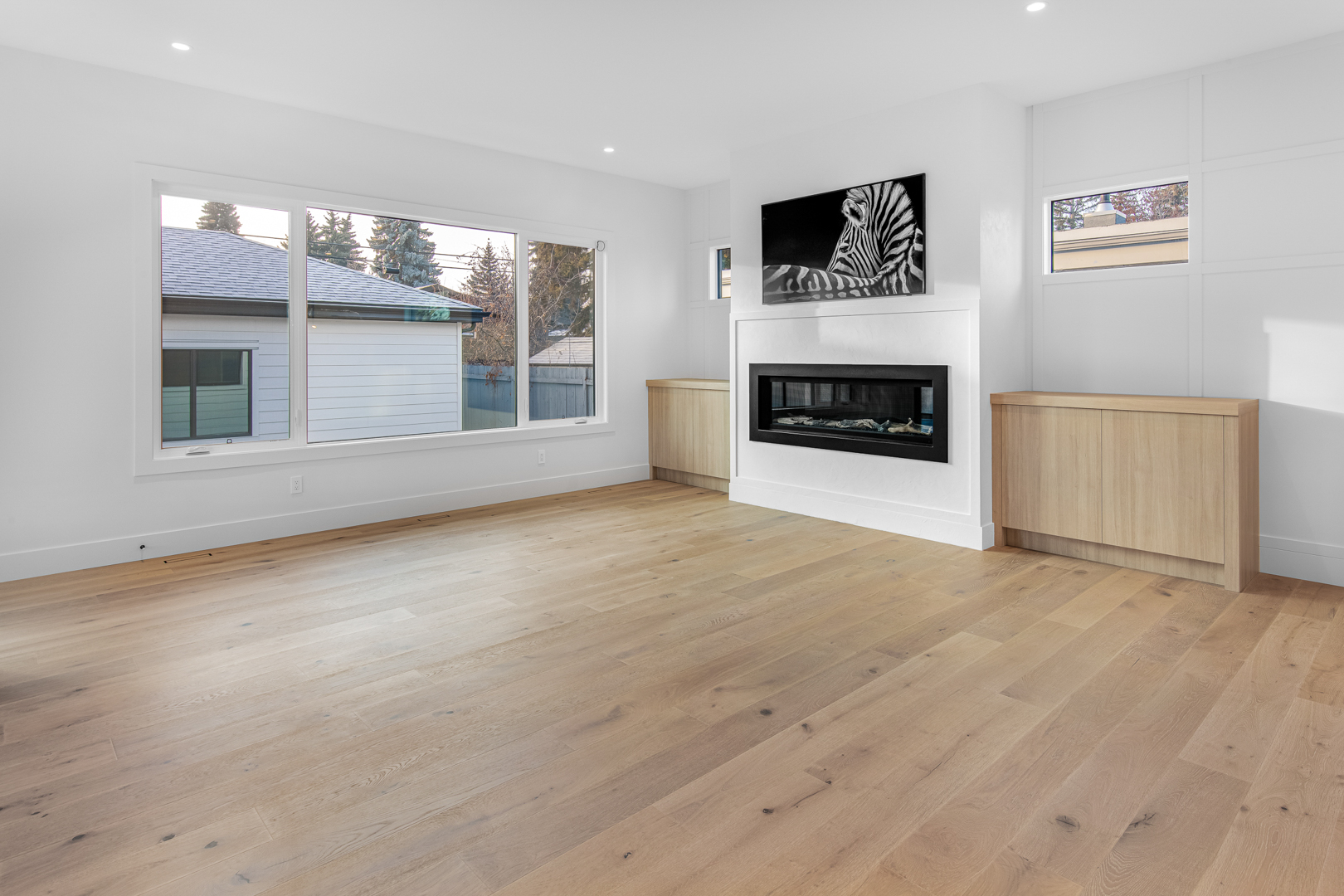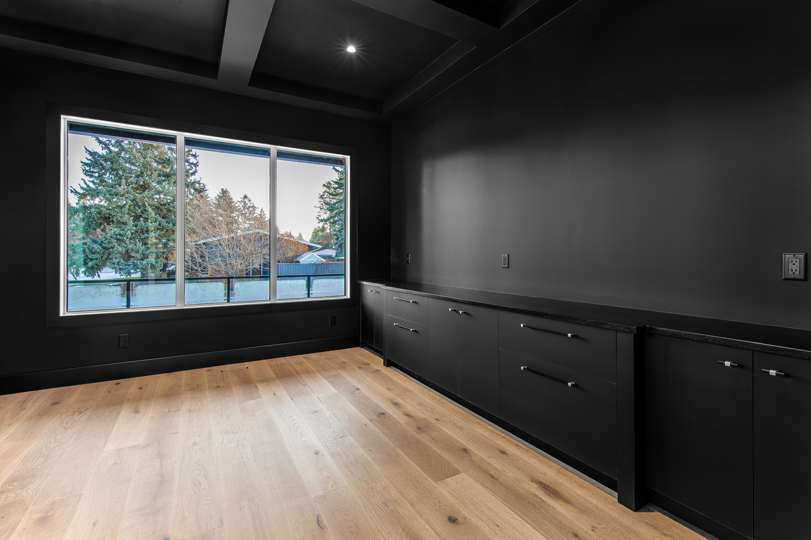The design incorporates state-of-the-art appliances seamlessly integrated into the cabinetry, maintaining a streamlined look that emphasizes practicality without sacrificing style. Strategic lighting accentuates the clean, geometric shapes within the space, highlighting the exquisite craftsmanship of the millwork. The expansive windows ensure ample natural light, enriching the warmth of the wood and enhancing the overall openness of the layout.