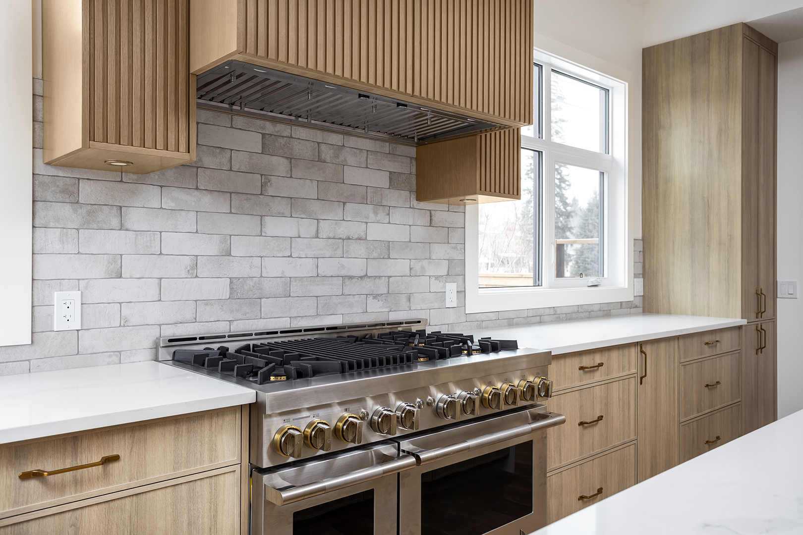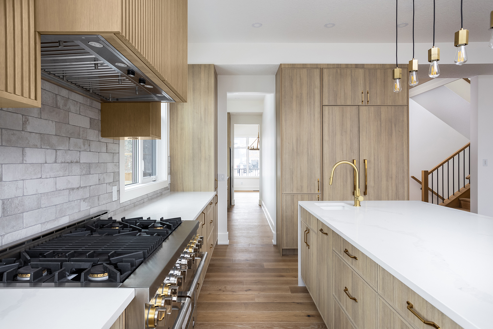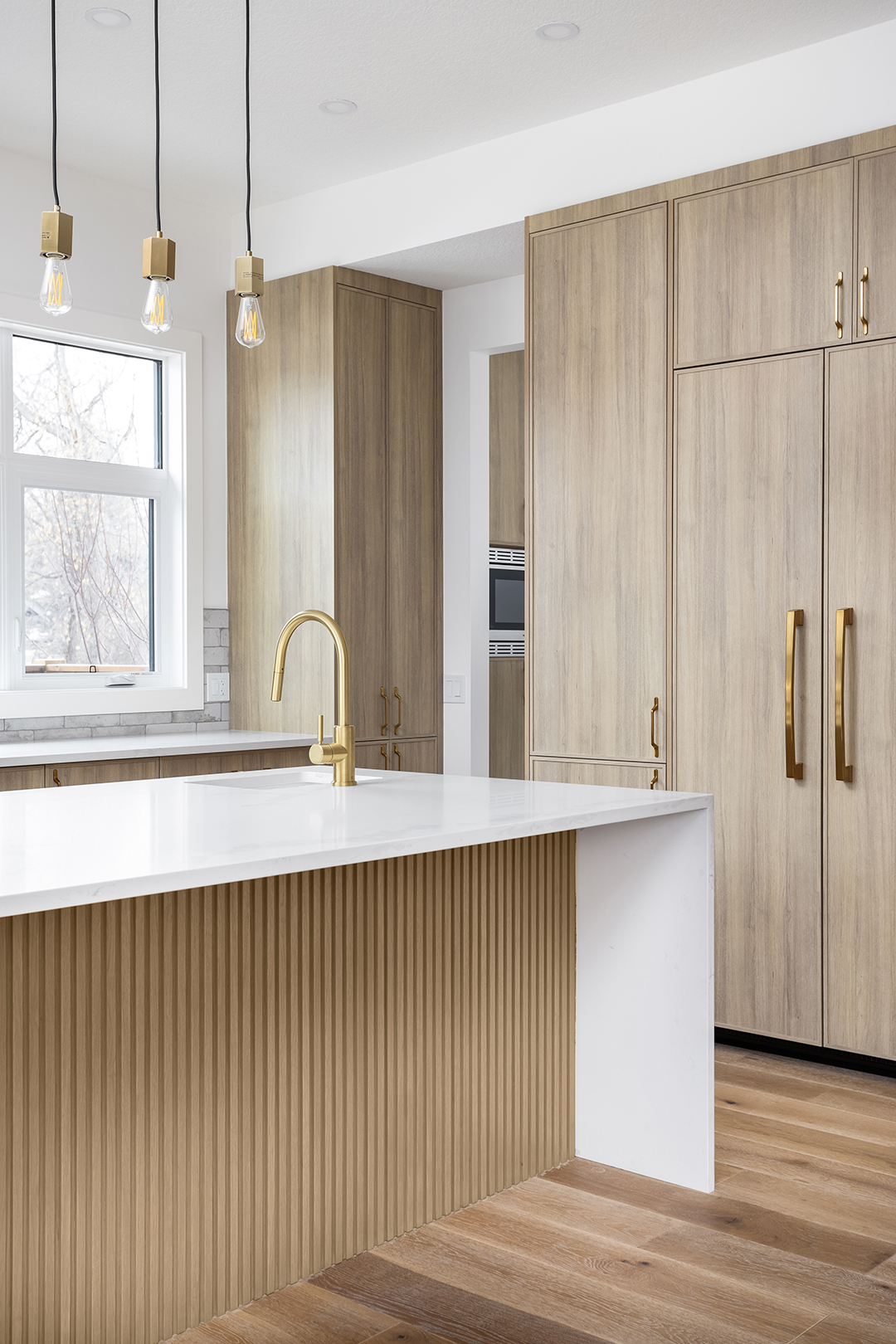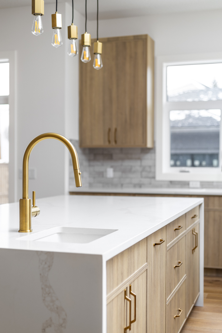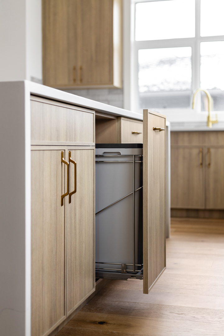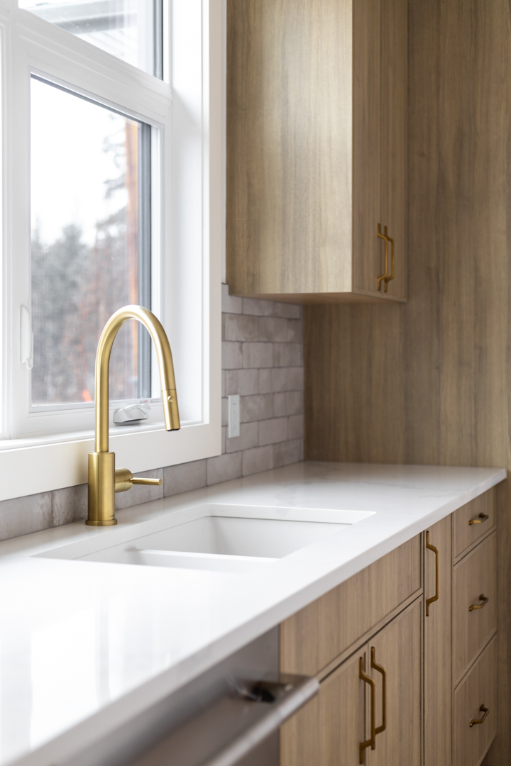 - Color Palette and Textures: The kitchen features a neutral color palette, highlighted by the natural wood tones and complemented by gold hardware, adding a touch of luxury. The crisp white countertops and backsplash provide a bright, clean look that contrasts beautifully with the wooden elements.