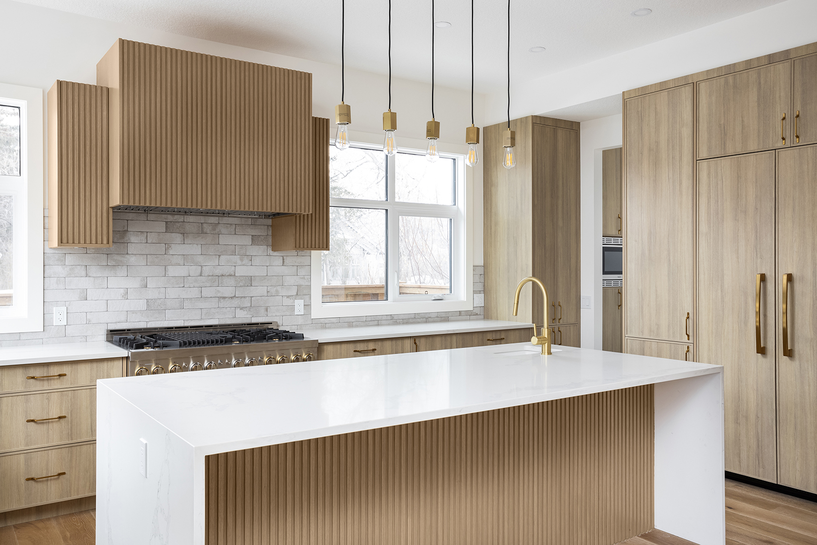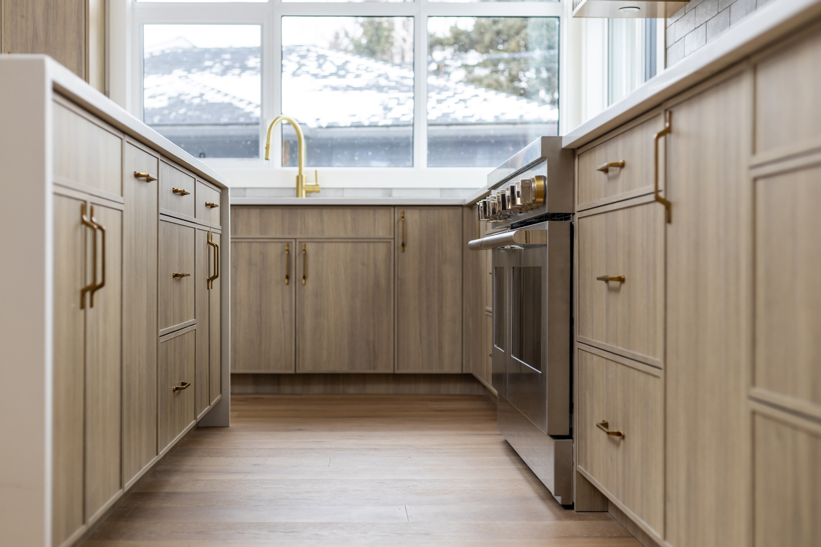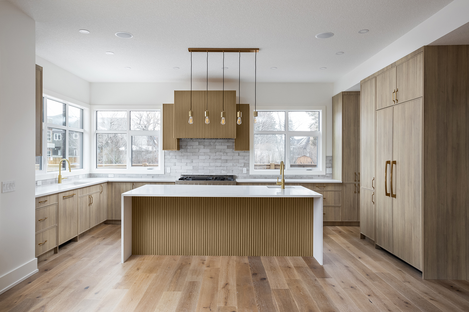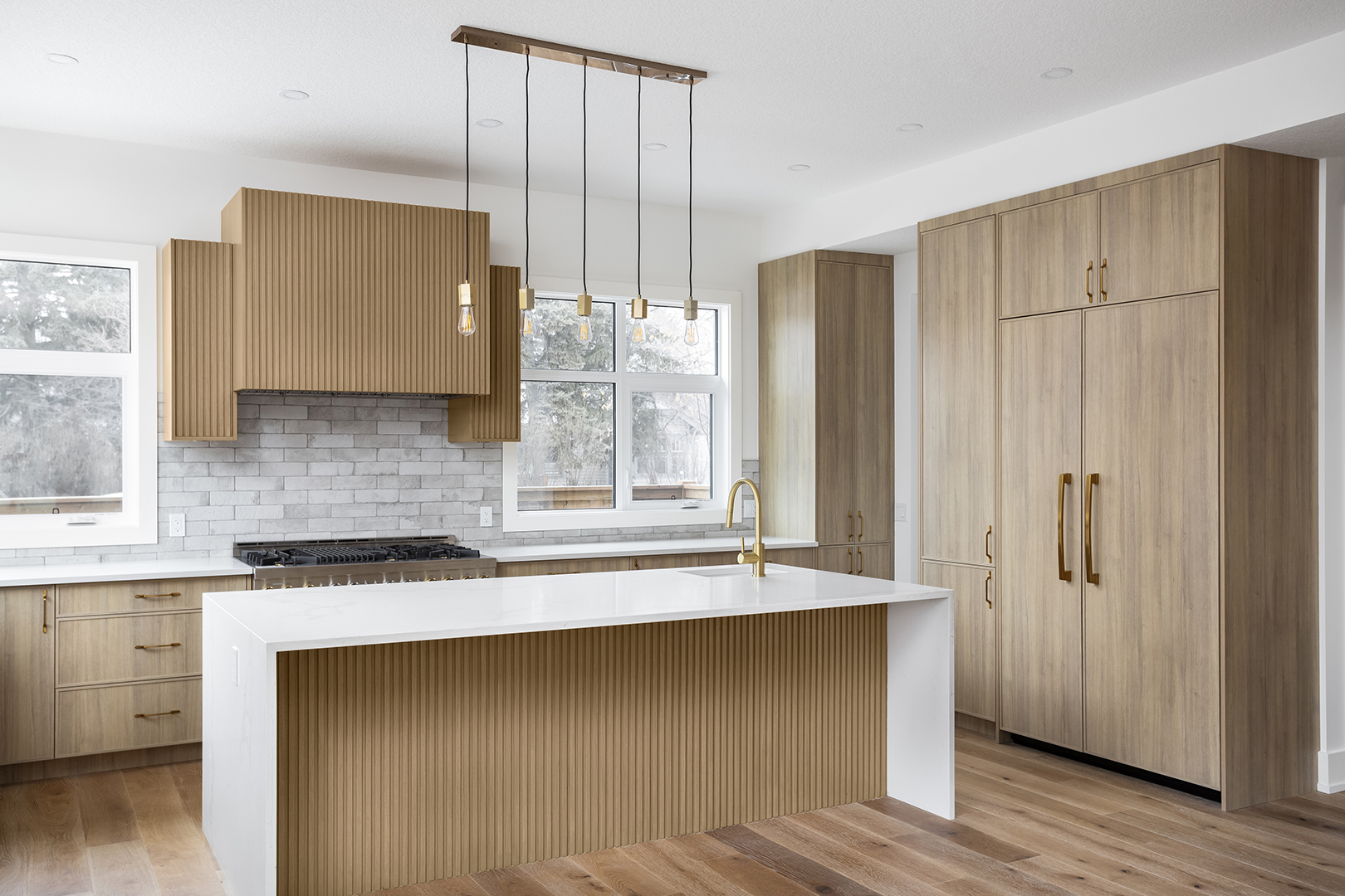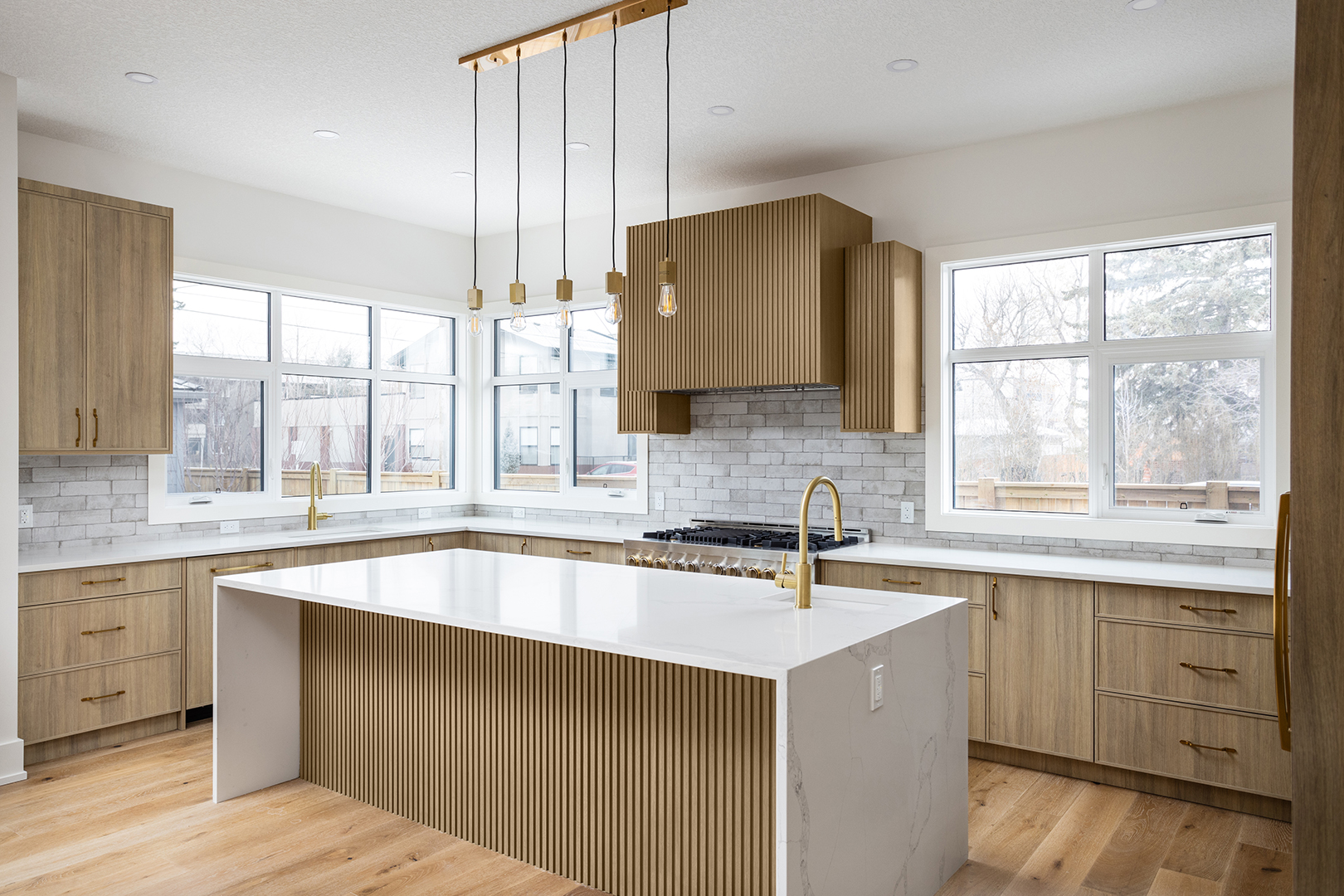 - Color Palette and Textures: The kitchen features a neutral color palette, highlighted by the natural wood tones and complemented by gold hardware, adding a touch of luxury. The crisp white countertops and backsplash provide a bright, clean look that contrasts beautifully with the wooden elements.