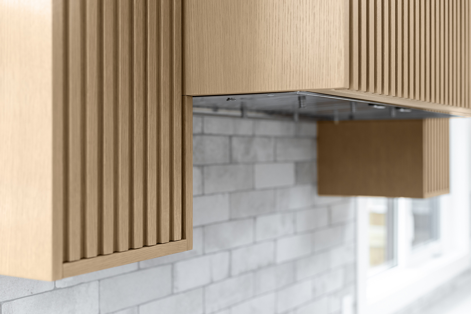 - Doors and Drawer Fronts: Made from Tafisa Rhapsody, the doors and drawer fronts exhibit a subtle and refined wood grain texture, imparting a natural and organic feel to the kitchen. The warm tone of the wood complements the overall light and airy ambiance of the space.