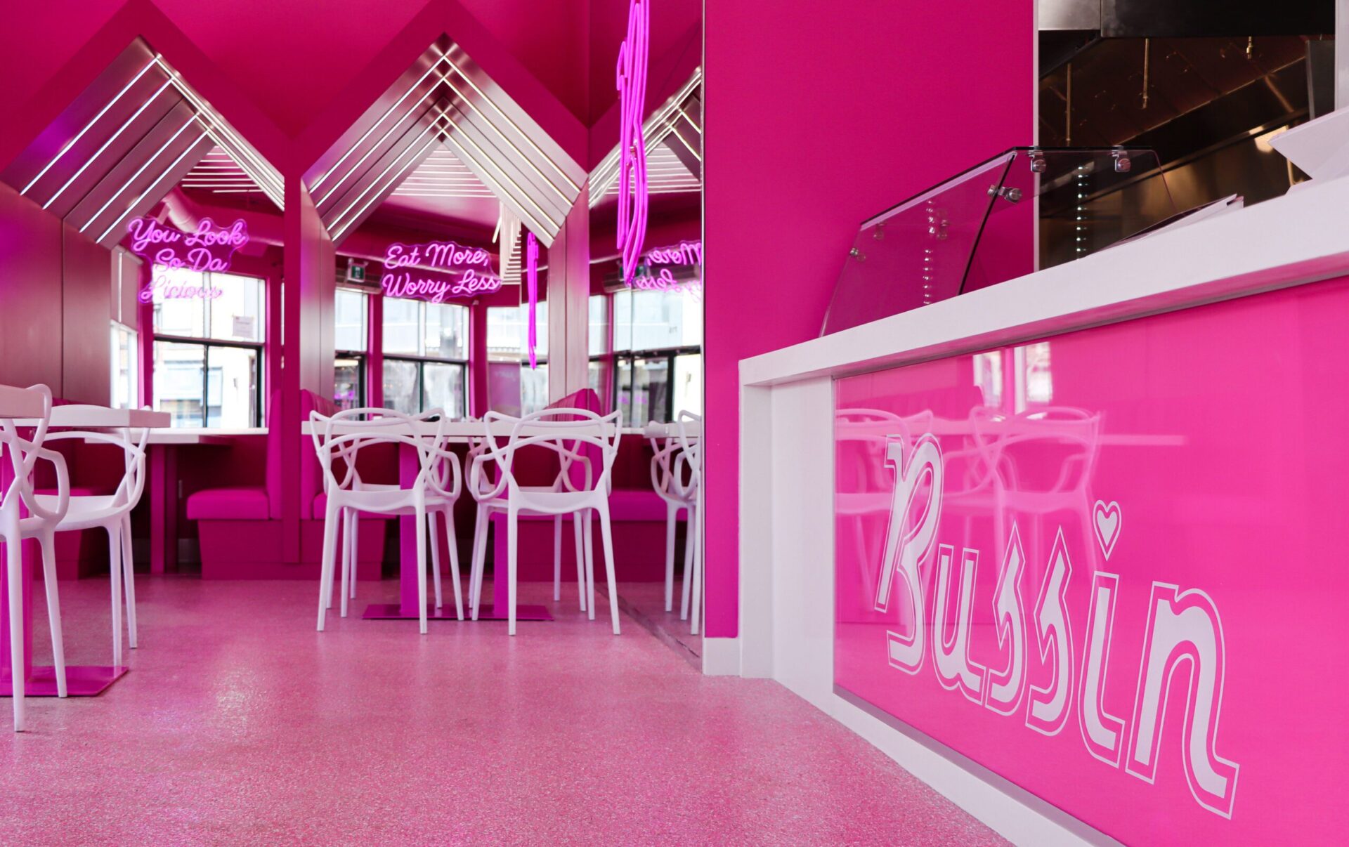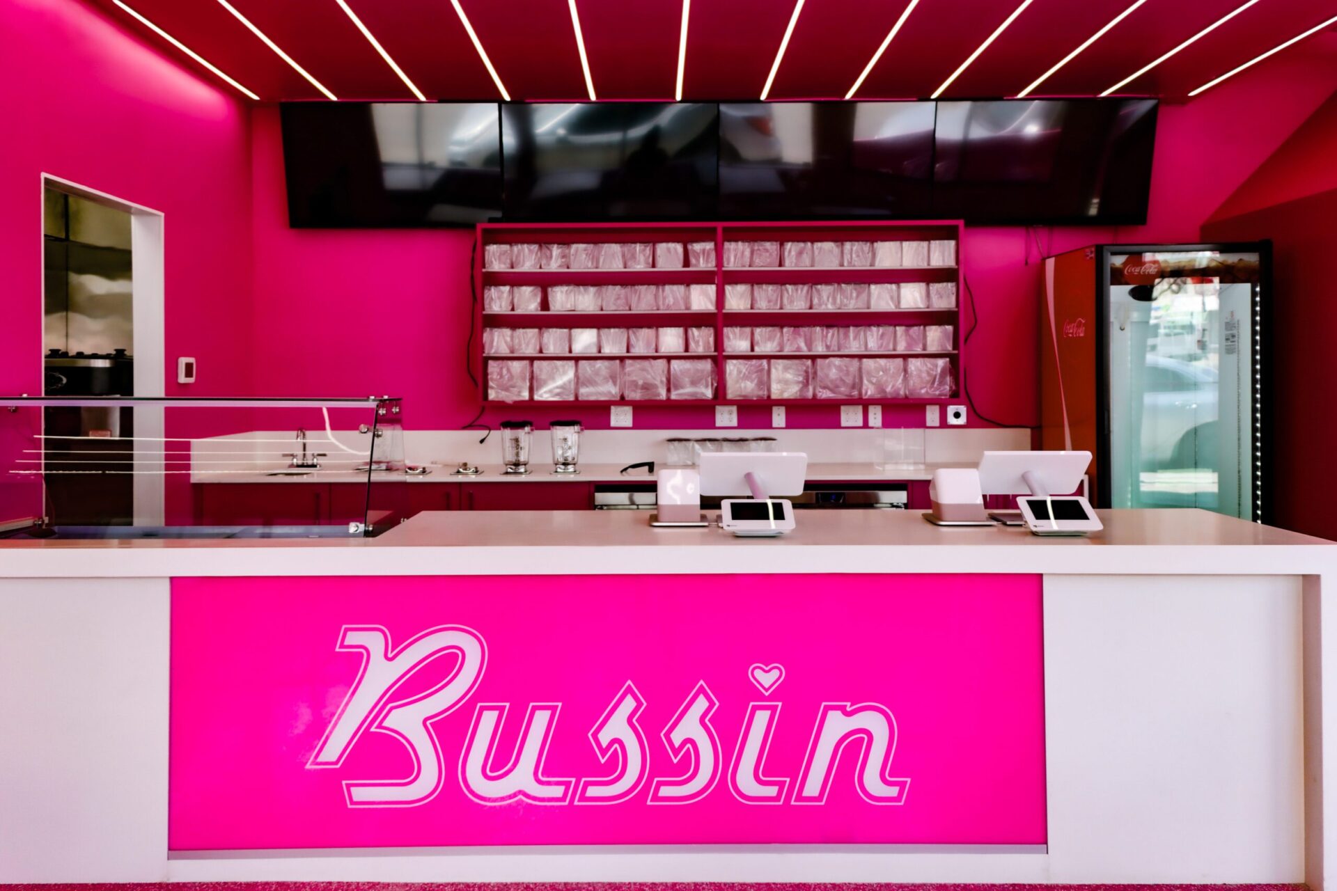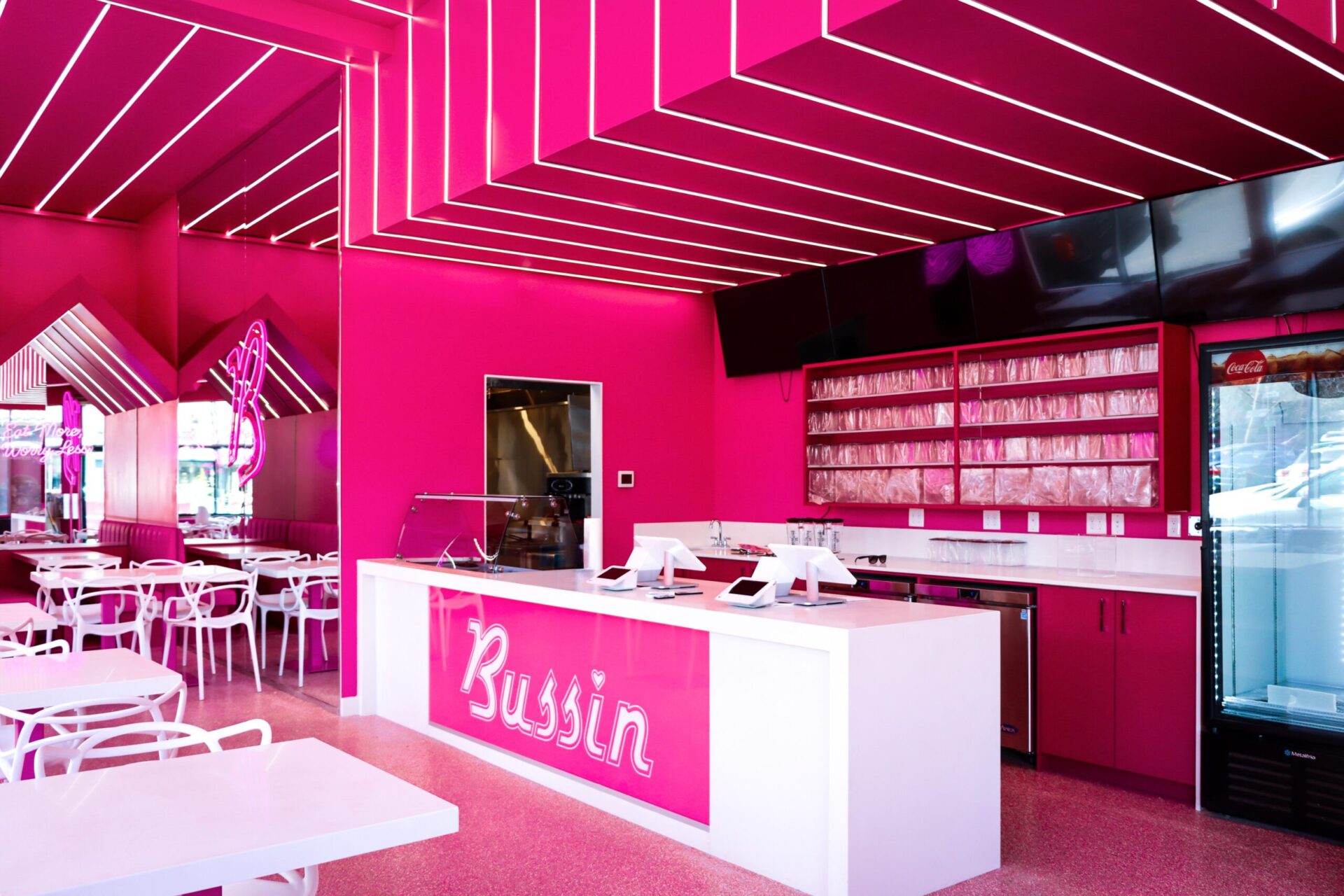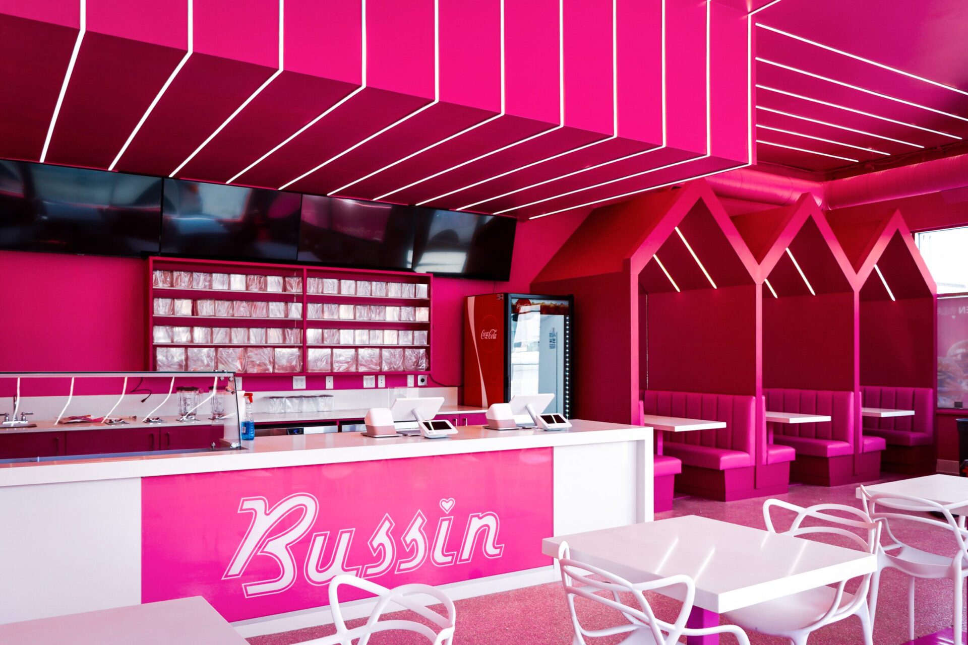 The centerpiece of the space is the custom millwork for the service counter, featuring the “Bussin” logo prominently displayed on the front. The cabinetry behind the counter is designed for efficiency and style, with open shelving and integrated storage solutions that cater to the fast-paced environment of a burger restaurant. The bright pink finish on the cabinetry contrasts sharply with the sleek white countertops, adding a sense of freshness and cleanliness to the overall design.