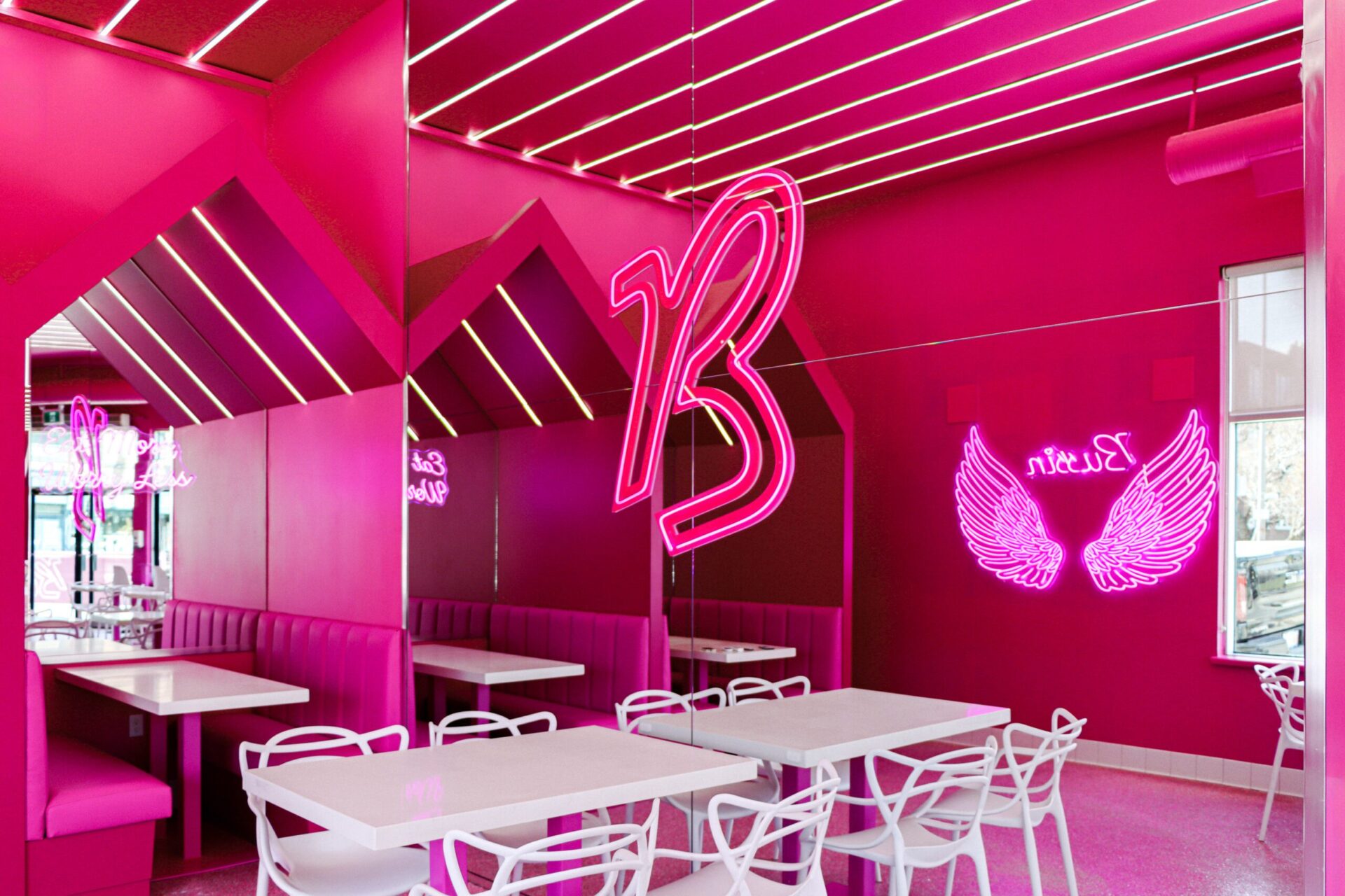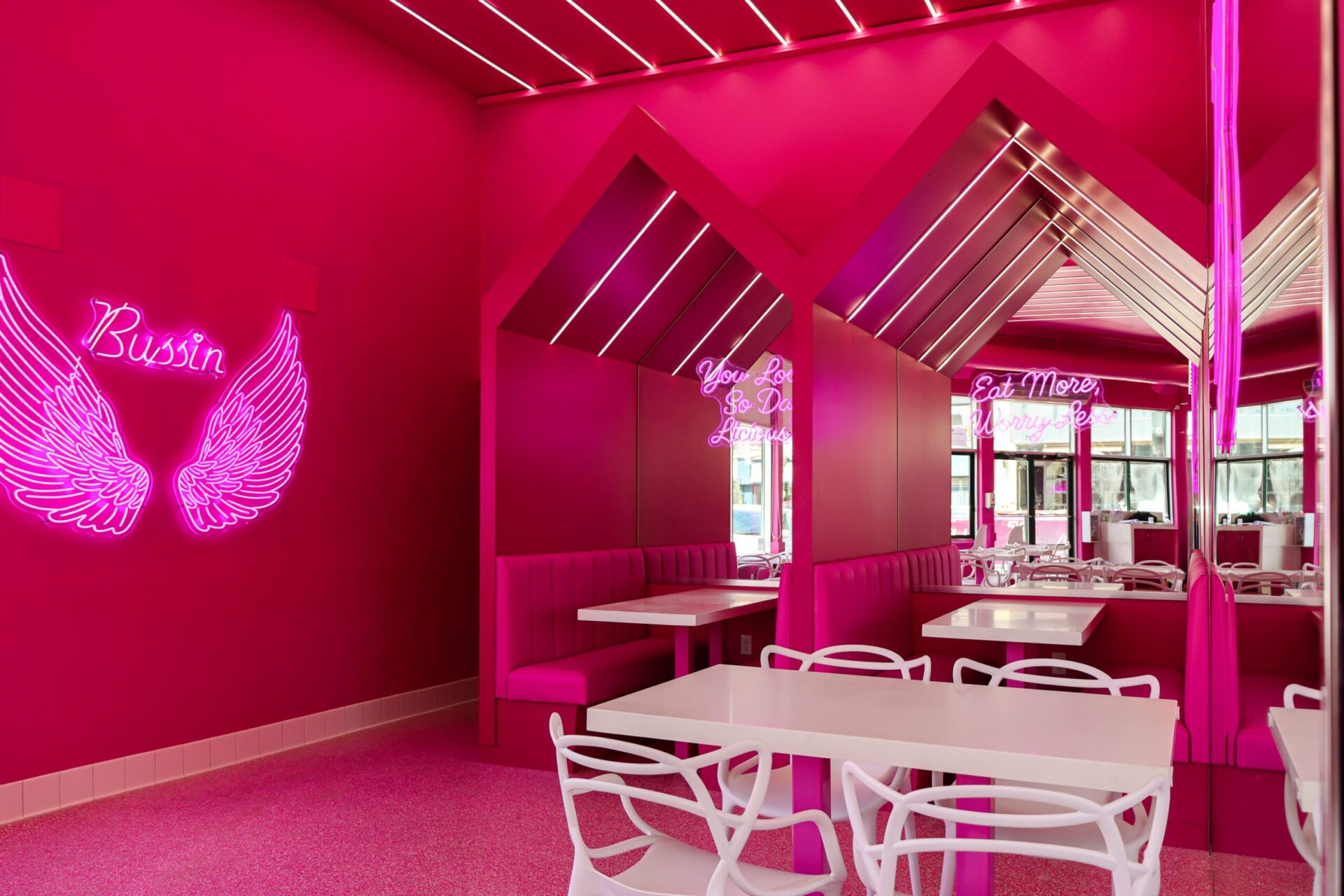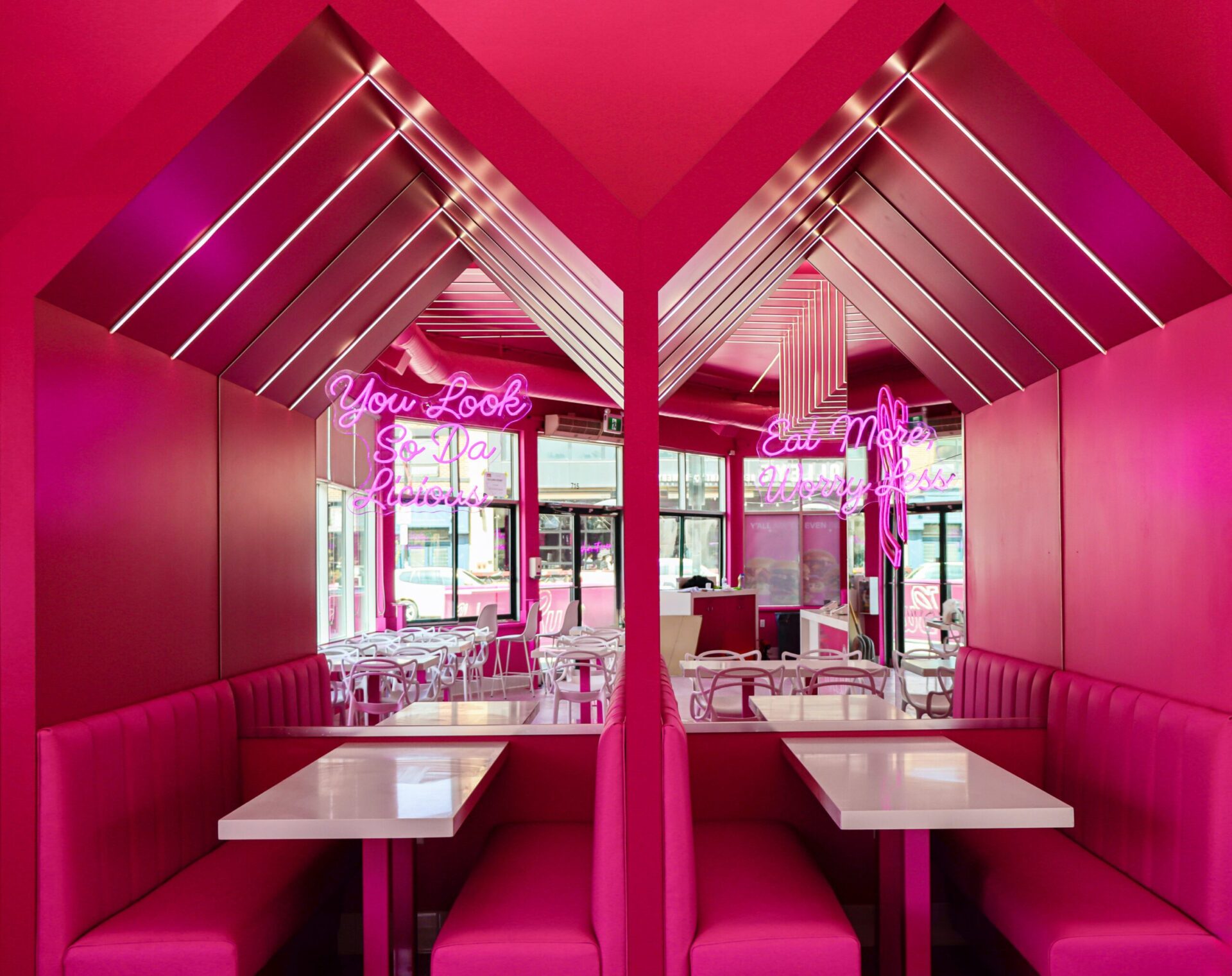 The ceiling features unique, angular millwork elements that extend the vibrant pink theme overhead, creating a cohesive and immersive experience for customers. The millwork is not only aesthetically pleasing but also highly functional, designed to withstand the demands of a busy commercial kitchen and dining area.