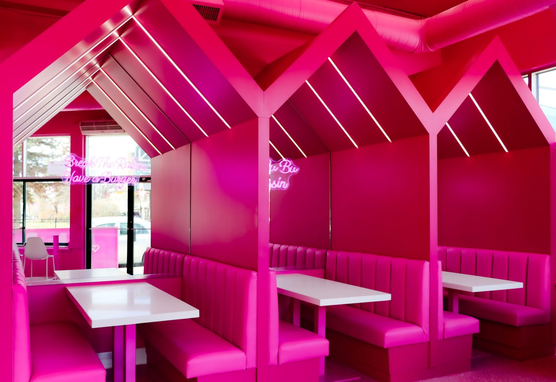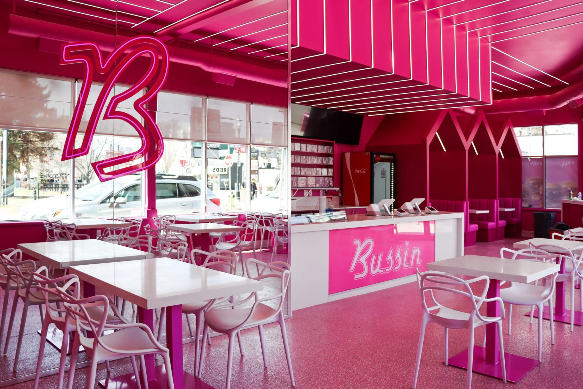 The Bussin Burger project in downtown Calgary is a vibrant and dynamic example of commercial millwork, showcasing Modersy’s ability to create bold, custom cabinetry that perfectly aligns with a brand’s identity. The interior is dominated by a striking hot pink color scheme, creating an energetic and inviting atmosphere that is both modern and playful.