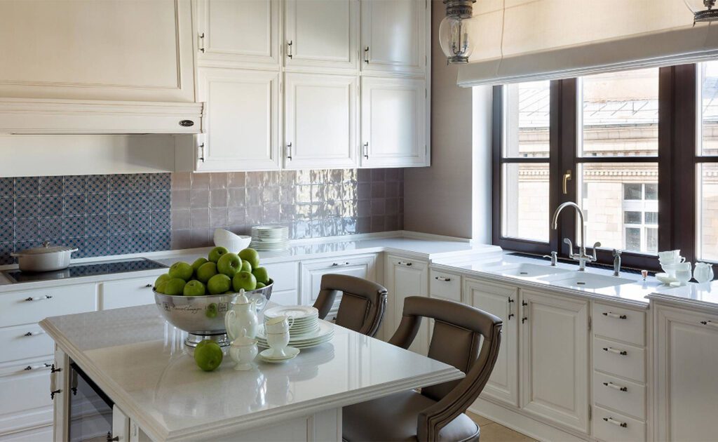 Consider the planned activities and the relationship between various items and devices within the island and kitchen as a whole. For example, it is advisable to place the dishwasher and garbage disposal near the sink. Adequate countertop space should be available next to the sink and stove. For safety and temperature comfort, the bar counter and dining table should not be positioned adjacent to the cooktop. Similarly, the refrigerator should not be placed next to heating appliances. Whether it’s a large or small kitchen, following the “working triangle” rule is desirable, as studies have shown that it can save up to 70% of the time spent on cooking and reduce unnecessary movements by up to 60%.
