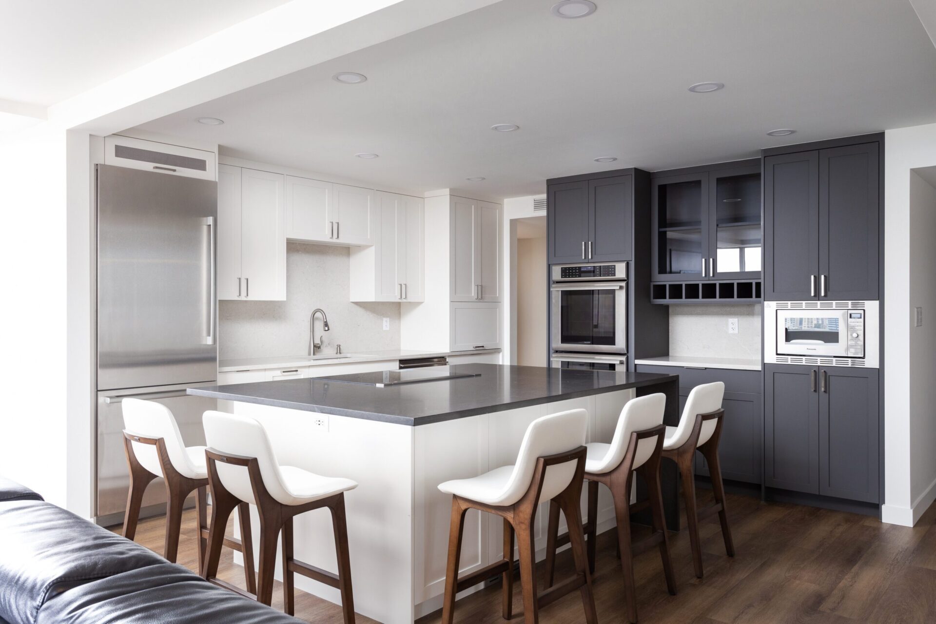 Enhanced Ergonomics: The additional work surfaces and cabinets in the center of the room make cooking more convenient, keeping everything within easy reach.