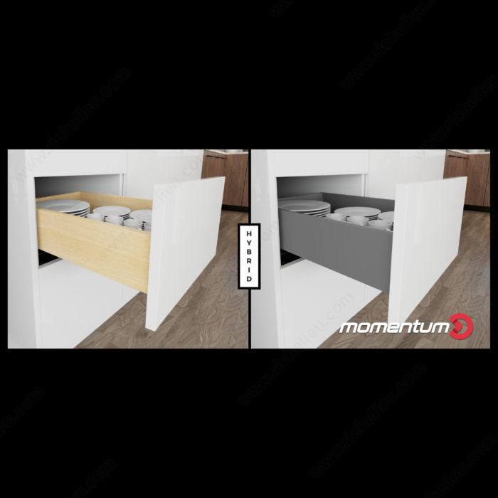 MOMENTUM can be used with traditional wood drawers or Richelieu OPTIMIZ-R metal drawers.