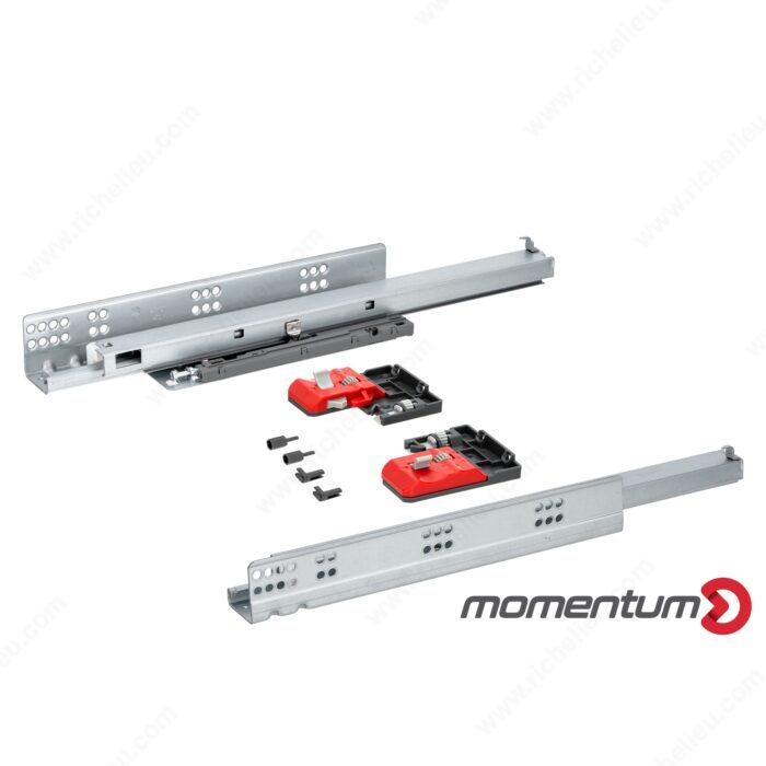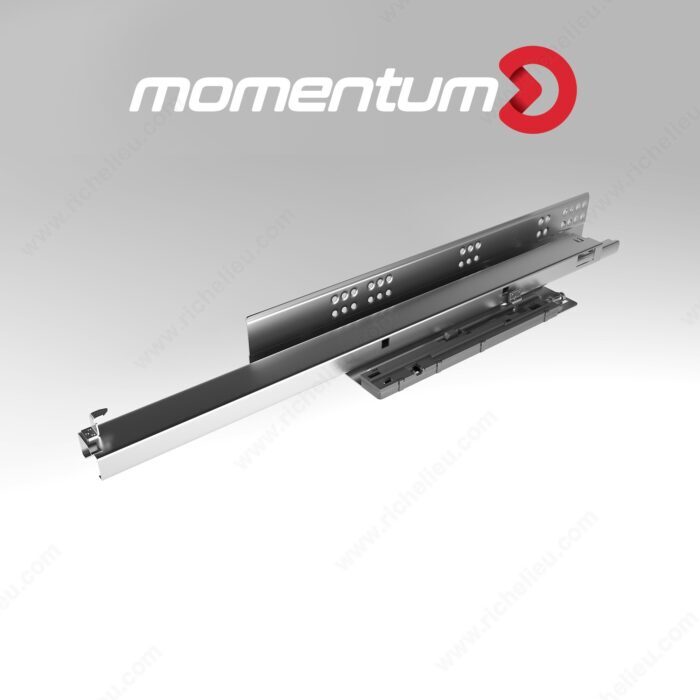 The MOMENTUM Push-to-Open Slide allows easy opening by simply pushing the drawer front. This unique slide design eliminates the need for handles or knobs, providing a sleek and modern aesthetic for furniture and cabinetry. The spring-loaded mechanism means a gentle push on the door activates the slide, causing it to glide open smoothly.